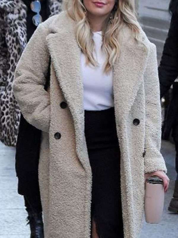 Younger Kelsey Peters Coat is designed from shearling wool material that contains internal viscose covering brands it calmer to up. This deluxe and feathery coat also contains a broad lapel collar, full-length occupied sleeves with open hem cuffs, two side waist pockets, and a frontal open style conclusion that makes it look remarkable. The Brown and white color combination show spirituality in all features.