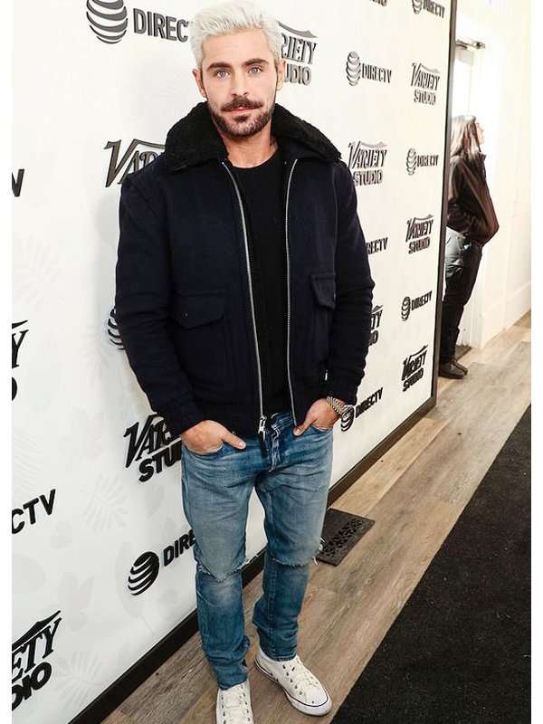 Zac Efron Casual Blue Bomber Shearling Collar Jacket
